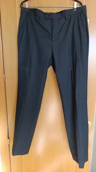 Traje de vestir de Zara Man Basic, en color negro. Solo se ha usado una vez. - Corte clásico. Negro oscuro. - Dos botones frontales. - Bolsillos de solapa. - Puños con cuatro botones. - Lavable - Talla 36 de pantalón y 44 de chaqueta (comprado como traje, no piezas sueltas)