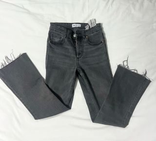 Pantalón cropped flare de Zara en color gris. Diseño moderno con corte acampanado y bajo deshilachado. Talla 34