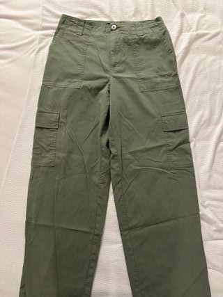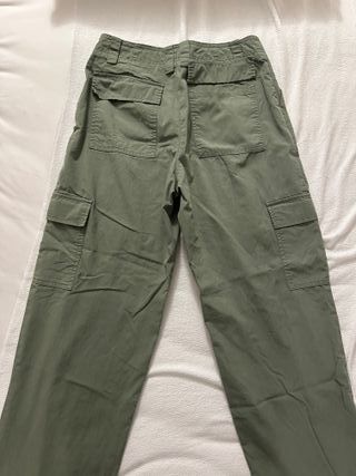 Pantalones cargo de Zara en color verde olivo. Diseño clásico con múltiples bolsillos. - Bolsillos frontales. - Bolsillos cargo en los laterales. - Bolsillos traseros con solapa.