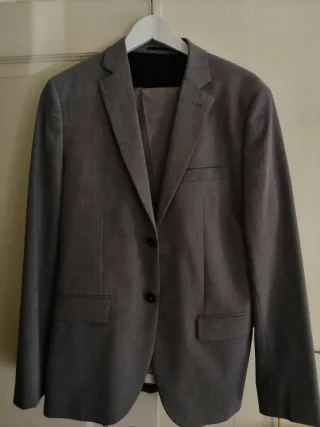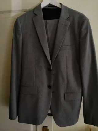 Traje de dos piezas en color gris. La chaqueta tiene dos botones y bolsillos frontales. - Chaqueta con solapa de muesca. - Pantalón de vestir a juego.