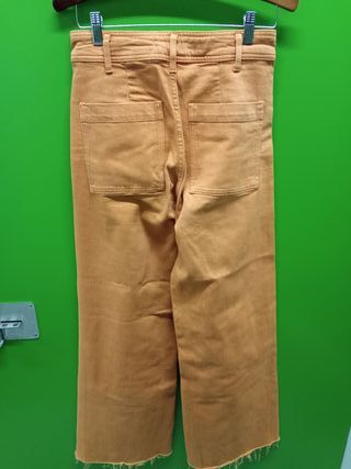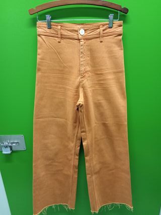 Pantalón vaquero de corte ancho. Pantalones anchos de mezclilla color mostaza con dobladillo deshilachado. - Cintura alta. - Bajo deshilachado. - Cierre de botón y cremallera. Cintura 37 Largo 104 Tiro 34