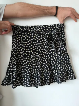 Falda-pantalon con volantes, lazo y cremallera lateral. Los volantes tienen algo de vuelo que queda precioso. No queda muy corta y es super cómoda. No tiene ningún defecto. La vendo porque ya no me sirve pero está perfecta.