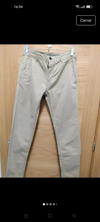 Pantalón chino de chico con corte slim. - Color beige. - Cierre de botón y cremallera. - Bolsillos delanteros y traseros. Muy poco uso. Están impecables Largo 99cm Ancho bajo pierna 13