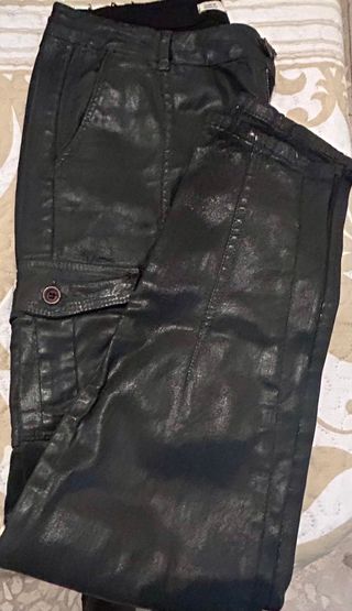 Pantalón de efecto piel en color negro. - Cintura con trabillas. - Bolsillos delanteros y traseros. - Bolsillo cargo en el lateral de la pierna. - Cierre con cremallera y botón.