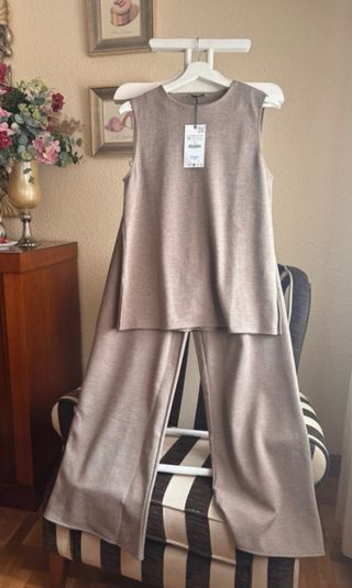 Conjunto de dos piezas de Zara, ideal para un look completo. top talla M y pantalón talla S. - Tejido de punto. - Diseño sin mangas en la parte superior. - Pantalón de corte ancho.