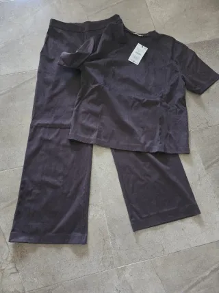 ZARA Conjunto efecto suede marron púrpura Talla S ambos partes Pantalón ancho Camiseta oversized Cremallera lateral comprado en vinted necesita talla M :(