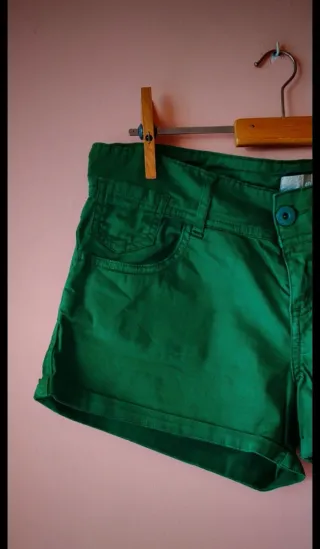 Short color verde. Marca Zara. Talla M. Medidas: ancho de cintura 40 cm. Largo de pantalón 26 cm. - Talla M. - Diseño con bolsillos delanteros y traseros. - Cierre de botón y cremallera.