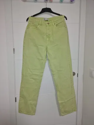 Pantalón vaquero de tiro alto. - Corte recto. - Color verde lima. - Cierre con botón y cremallera.
