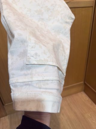 Pantalón de corte ajustado en color blanco. Diseño moderno y versátil. Tiene una pequeña mancha q la altura del muslo derecho. - Bolsillos delanteros. - Cierre de cremallera y botón.