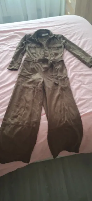 Mono de la marca Mango en color verde oliva. Es una prenda de una sola pieza con cinturón. - Manga larga. - Cuello camisero. - Bolsillos en el pecho. - Cinturón a juego. - Piernas anchas.