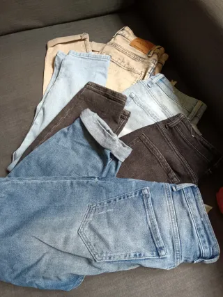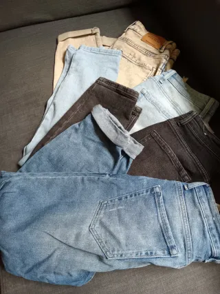 Lote de tres pantalones vaqueros estilo Mom Fit. - Pantalón de color beige con efecto desgastado. - Pantalón de color azul claro. - Pantalón de color azul oscuro. Se venden solo o x lote, cada uno a 5e, lote a 15e