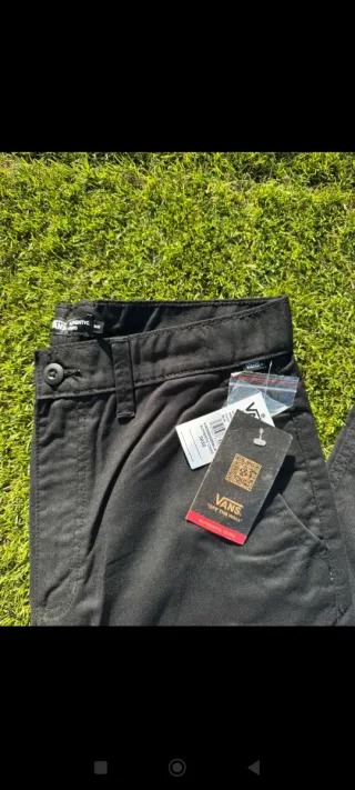 Pantalones de la marca Vans, en color negro y a estrenar. - Talla 32. - Cierre de botón y cremallera. - Bolsillos delanteros y traseros.