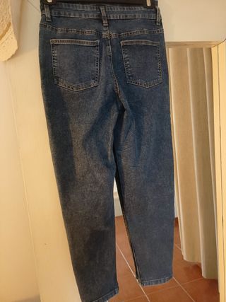 Pantalón vaquero de corte Mom Fit con cintura alta. Talla 36,pero al ser elástico también vale para 38. Dos puestas - Tejido elástico para mayor comodidad. - Diseño desgastado. - Cierre de cremallera y botón.