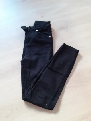 Pantalones vaqueros de Bershka en talla XS. Son de color negro y de corte ajustado. - Cierre de cremallera y botón. - Bolsillos delanteros y traseros.