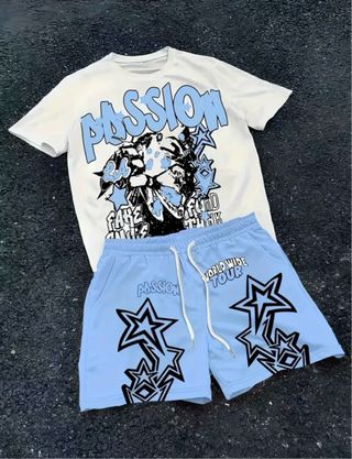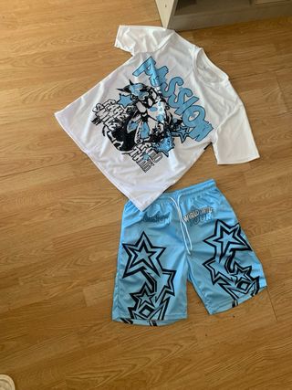Conjunto de camiseta y pantalón corto con estampado. - Camiseta blanca con estampado gráfico. - Pantalón corto azul claro con estampado de estrellas y texto.