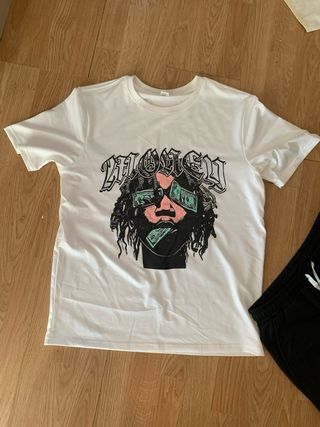 Conjunto de camiseta blanca y pantalón corto con estampado. - Camiseta con estampado gráfico Money y rostro. - Pantalón corto con estampado de camuflaje y Money en la parte inferior. - Cordón ajustable en la cintura del pantalón corto. - Rayas laterales en el pantalón corto.