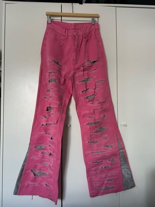 Pantalón vaquero rosa con detalles plateados y rotos. - Diseño customizado a mano. - Piernas acampanadas con detalle plateado. - Aberturas y rotos decorados con tela plateada.