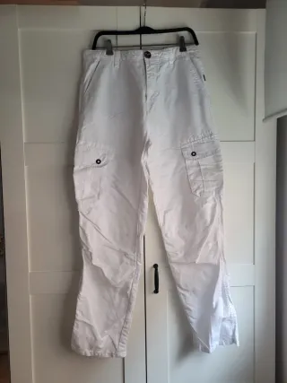Pantalones cargo de color blanco, ideales para un estilo casual. - Cintura con trabillas para cinturón. - Cierre de botón y cremallera. - Bolsillos cargo laterales con botón. - Bolsillos traseros. - Tejido de algodón.
