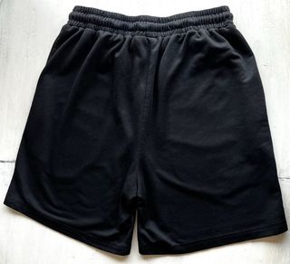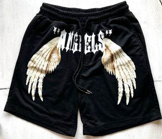 Pantalón corto de Shein color negro con estampado de alas "Angels". Estilo streetwear con cintura elástica y cordón. En buen estado, con el desgaste propio del uso. Medidas aproximadas en plano: • Cintura: 31 cm (sin estirar) / 45 cm (estirada) • Largo total: 41 cm • Tiro: 29 cm Ideal para un look urbano y cómodo. Composición 100% poliéster.