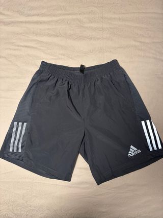 Conjunto deportivo Adidas para running. - Camiseta amarilla con logo Wings for Life World Run. - Pantalón corto gris de 7” con detalles reflectantes y logo Adidas. - Tiras icónicas de Adidas en mangas y pantalón.