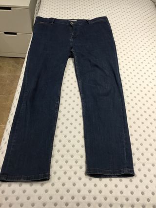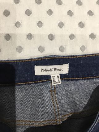 Vendo pantalón de señora de Pedro del Hierro, talla 46 azules, son tobilleros y el único defecto que tienen es la mancha en la marca, por lo demás están completamente nuevo. Talle alto - Tejido denim resistente. - Cintura con trabillas para cinturón. - Cierre de cremallera y botón.