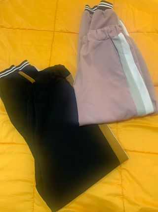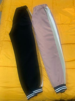 Conjunto de dos pantalones de chándal con detalles deportivos. - Un pantalón es de color negro con detalle marrón y rayas blancas y negras en la cintura. - El otro pantalón es de color rosa pálido con rayas blancas y grises en el lateral y cintura elástica.