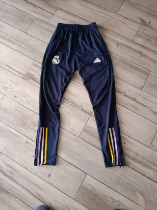 Pantalón deportivo del Real Madrid con detalles de Adidas. - Diseño en color azul marino. - Rayas multicolores en los tobillos (morado, amarillo, blanco). - Logo del Real Madrid y Adidas visibles. -Interesad@ le mando medidas exactas de pantalón para evitar dudas