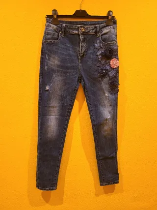 Pantalón vaquero de corte ajustado con detalles florales. - Diseño desgastado. - Adornos florales en relieve. - Cierre de botón y cremallera. Talla - 5 euros.