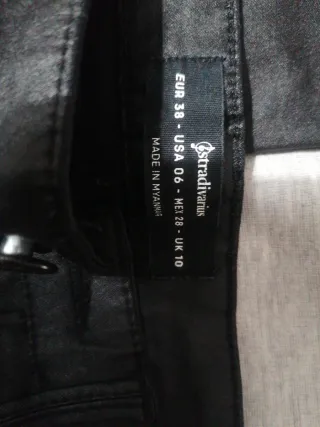 Pantalón de Stradivarius con acabado engomado. - Talla EUR 38, USA 06, MEX 28, UK 10. - Fabricado en Myanmar.