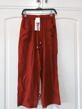 Pantalón ancho de Zara en color teja, ideal para un estilo casual. - Tejido de lino. - Cintura elástica con cordón ajustable y detalles de cuentas. - Bolsillos laterales. - Corte ancho y tobillero.