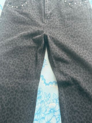 Pantalones grises con un llamativo estampado de leopardo. - Diseño de leopardo en tono oscuro. - Cintura con detalles de tachuelas.