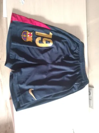 Pantalones deportivos de color azul con detalles en color burdeos y dorado. - Escudo del FC Barcelona. - Número 19 en dorado. - Logo de Nike. - Cintura elástica.