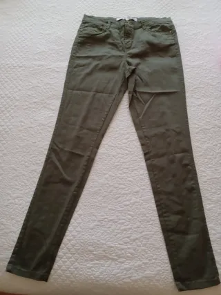 Pantalón de corte recto en color verde. Cintura 38 cm Cadera 43 cm Alto 98 cm - Cintura con trabillas para cinturón. - Cierre de cremallera y botón. - Bolsillos delanteros y traseros.