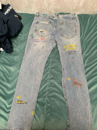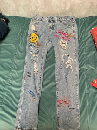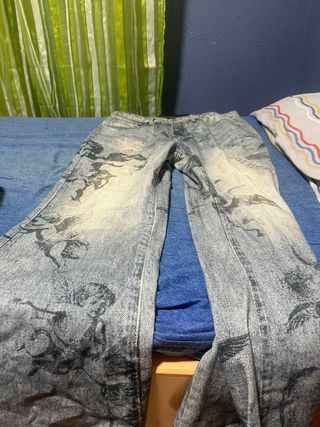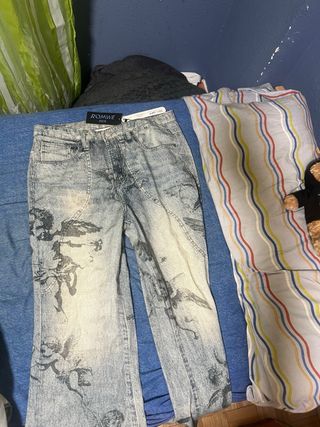 Pantalón baggy con un diseño único y llamativo. Perfecto para un estilo urbano y moderno. - Estampado de querubines en toda la prenda. - Corte ancho y cómodo. - Lavado desgastado para un look vintage.