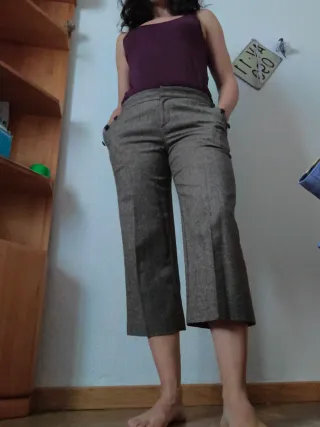 Pantalones de tipo capri con un diseño elegante. Color marrón y detalles de botones en los bolsillos.