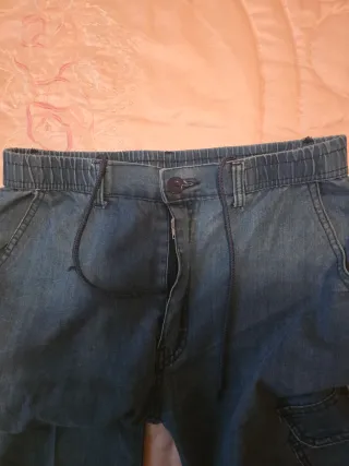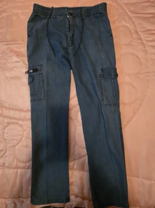 Pantalones vaqueros con múltiples bolsillos. - Cintura elástica con cordón. - Bolsillos laterales con cremallera. - Bolsillos cargo en los muslos. - Bolsillos traseros - Tal y como se ve en las fotos. - Un par de usos