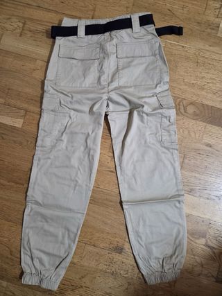 Pantalón cargo de color beige, ideal para mujer y completamente nuevo. - Diseño moderno con múltiples bolsillos. - Cinturón negro incluido. - Bajos elásticos. *Tengo más tallas, si la tuya no corresponde con el anuncio, pídemela por mensaje y comprobamos disponibilidad.