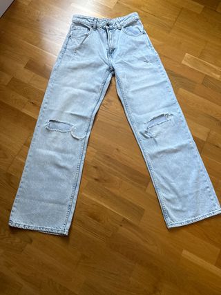 Pantalón vaquero de corte ancho y estilo desgastado. - Tiro alto. - Piernas anchas. - Efecto desgastado con rotos en rodillas y muslos.
