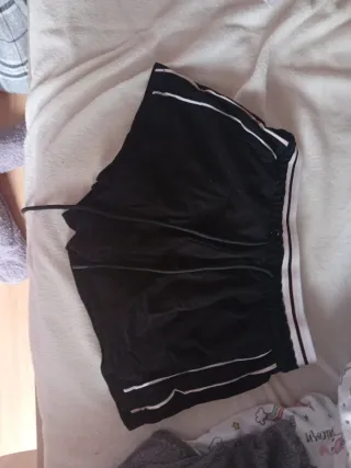 Pantalones cortos deportivos de color negro con detalles de rayas blancas en los laterales. - Cintura elástica con cordón. - Ribetes blancos en los bajos.