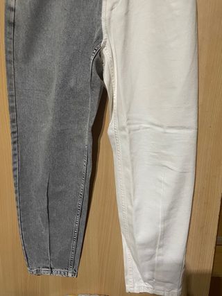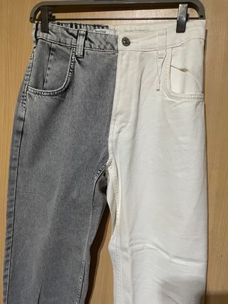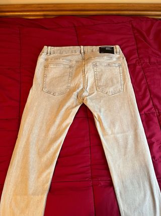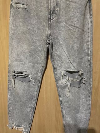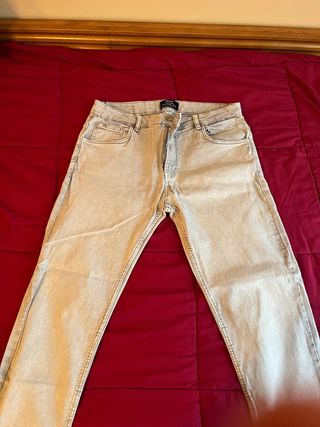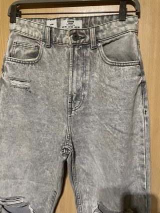 Pantalones vaqueros de la marca Bershka en color gris, talla 44. - Diseño clásico de cinco bolsillos. - Cierre de cremallera y botón. - Costuras reforzadas.