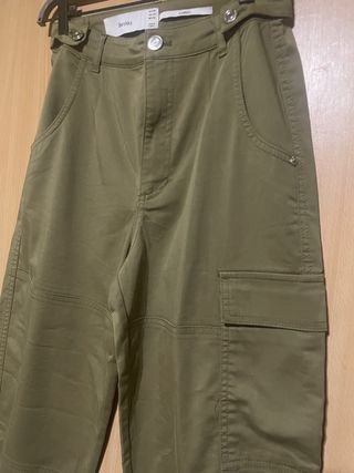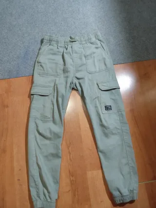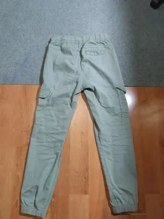 Pantalón tipo cargo de color verde. Cuenta con bolsillos laterales y cintura elástica. - Cintura con cordón ajustable. - Puños elásticos en los tobillos. - Bolsillos de parche en los muslos.