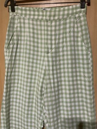 Pantalón palazzo de corte ancho y estampado de cuadros gris con una fina raya verde agua - Diseño de talle alto. - Pinzas delanteras para mayor volumen. Cremallera trasera - Cintura con trabillas y bolsillos laterales