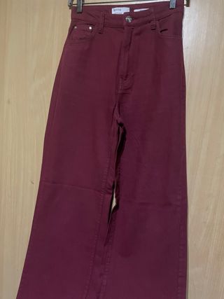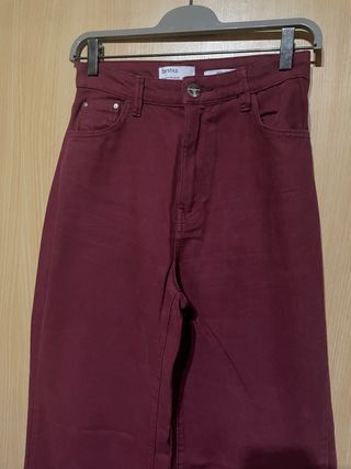Pantalón vaquero de color rojo con tejido elástico. - Cintura con trabillas para cinturón. - Cierre de botón y cremallera. - Bolsillos delanteros y traseros.