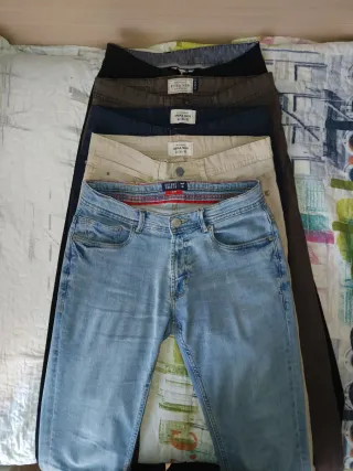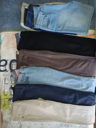 ***CONSULTAR PRECIOS EN CHAT*** Conjunto de pantalones vaqueros y chinos. Cortos y largos en buen estado y cuidados. INCLUYE: - Pantalones vaqueros largos beige, marrón y azul marino SFERA TALLA 38 - Pantalón vaquero largo azul GREEN COAST TALLA 38 - Pantalón chino largo negro EASY WEAR TALLA 36 - Pantalones vaqueros cortos azul claro, azul oscuro y beige UNIT TALLA 15-16