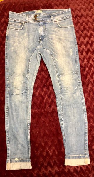 Pantalón vaquero de corte baggy con detalles pitillo. - Diseño desgastado. - Cintura con trabillas. - Cierre de cremallera y botones. - Bolsillos delanteros y traseros. - Dobladillo en los bajos.