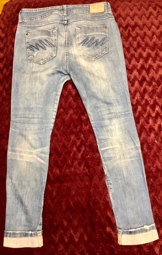 Pantalón vaquero de corte ajustado con detalles desgastados. - Diseño con rotos en las rodillas. - Tiro alto. - Cierre de cremallera y botón.