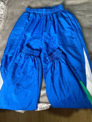 Pantalón de estilo deportivo con un diseño llamativo. - Tejido ligero y brillante. - Paneles laterales en azul. - Forro interior en color morado. - Cremalleras en los bolsillos. - Cremalleras en tobillos.