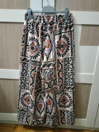 Pantalón largo con estampado llamativo. - Cintura elástica. - Diseño con motivos florales y paisley. - Tejido ligero y cómodo.