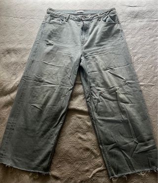 Pantalón vaquero de corte ancho y estilo desgastado. - Piernas amplias. - Bajo deshilachado. - Detalle de rotos en la zona de la rodilla.
