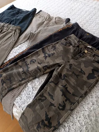 Lote de cinco pantalones de vestir y casuales, más uno de regalo. Tallas S y M. - Pantalón negro de vestir. - Pantalón verde militar tipo cargo. - Pantalón de cuadros marrón y blanco. - Pantalón negro con estampado de leopardo. - Pantalón de camuflaje verde y negro.